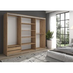 Wewnątrz szafy przesuwnej znajduje się sześć półek na ubrania, dwa drążki na wieszaki, które pomogą w organizacji krótszych ciuchów, oraz jeden drążek na długie rzeczy typu sukienki, płaszcze. Dodatkowo, można szafę wyposażyć w komplet szuflad. Przemyślany układ wnętrza umożliwia wygodne przechowywanie ubrań różnego rodzaju.
