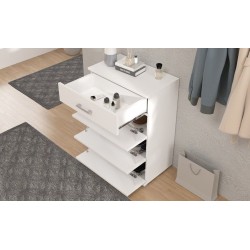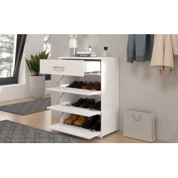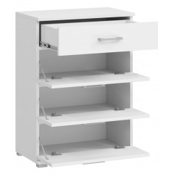 Szafka ma cztery fronty – jeden klasyczny wysuwany na prowadnicach oraz trzy uchylne schowki na obuwie. Dzięki temu pomieści wiele par butów, zachowując porządek i estetyczny wygląd pomieszczenia.