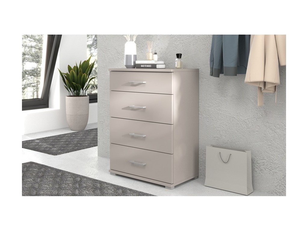 Wykonana z gładkiej płyty laminowanej o grubości 16 mm w kolorze kaszmir , cechuje się trwałością i łatwością w utrzymaniu czystości. Plastikowe uchwyty i nóżki w kolorze srebrnym nadają jej eleganckiego, nowoczesnego wyglądu.