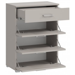 Szafka ma cztery fronty – jeden klasyczny wysuwany na prowadnicach oraz trzy uchylne schowki na obuwie. Dzięki temu pomieści wiele par butów, zachowując porządek i estetyczny wygląd pomieszczenia.