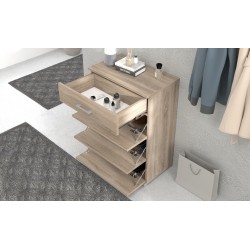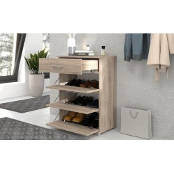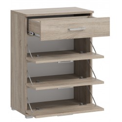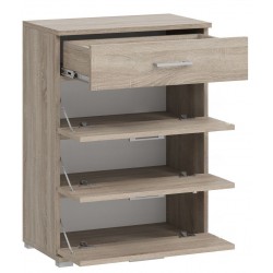 Szafka ma cztery fronty – jeden klasyczny wysuwany na prowadnicach oraz trzy uchylne schowki na obuwie. Dzięki temu pomieści wiele par butów, zachowując porządek i estetyczny wygląd pomieszczenia.