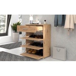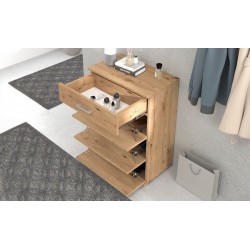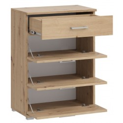 Szafka ma cztery fronty – jeden klasyczny wysuwany na prowadnicach oraz trzy uchylne schowki na obuwie. Dzięki temu pomieści wiele par butów, zachowując porządek i estetyczny wygląd pomieszczenia.