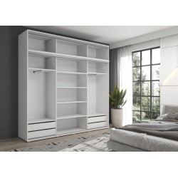 MONTI SLIM pojemna szafa przesuwna biała 260×247×45 to wyjątkowo funkcjonalny i trwały mebel do przechowywania całej garderoby. Dzięki dużemu lustru, solidnym materiałom i starannemu wykończeniu jest to zakup na lata. System półek, szuflad i drążków sprawia, że utrzymanie porządku staje się łatwe i wygodne.